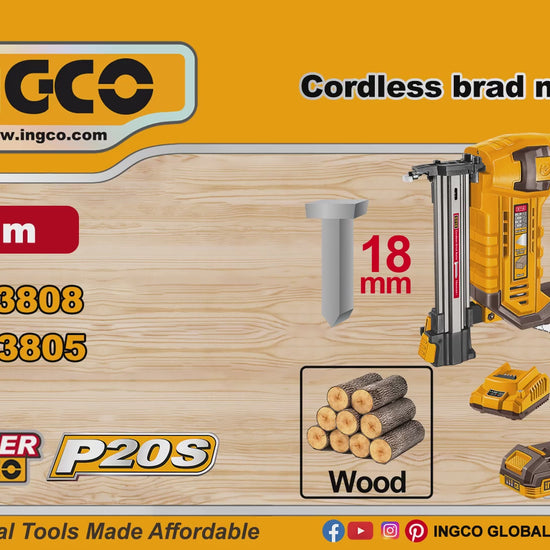 Cordless 20V Brick Nailer using ST18mm nail type. Drive rate 2 nails/s. Magazine capacity 65pcs. For Brick, Concrete, Iron Sheets, Wood. Includes: 200 pcs concrete nails 18mm, 1 pcs air nozzle, 1 pcs pin, 1 pcs 20V 2.0Ah battery and charger. Case.