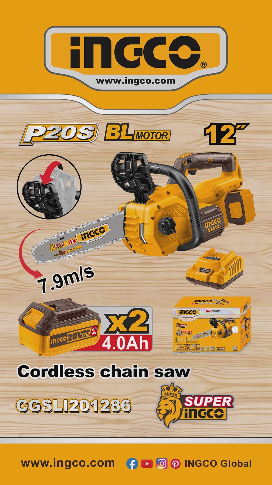 The INGCO CGSLI201286 20V Brushless Cordless Chainsaw combines compact size with impressive cutting performance, making it ideal for pruning, trimming branches, cutting firewood and general outdoor maintenance. The 12″ (30cm) bar provides a perfect balance of cutting capacity and control, while the brushless motor delivers higher efficiency, increased power and longer life compared to brushed chainsaws. With a fast 7.9 m/s chain speed, the chainsaw cuts cleanly and efficiently through branches and small logs. The automatic chain lubrication system ensures smooth operation and reduces wear, while the quick chain brake enhances safety by stopping the chain rapidly in emergency situations. Supplied with two 4.0Ah lithium-ion batteries and a fast charger, you get extended cutting time and minimal downtime. As part of the INGCO P20S 20V battery platform, these batteries are compatible with a wide range of INGCO cordless tools. Reliable, portable and easy to use, the CGSLI201286 is perfect for gardeners, homeowners, landscapers, and professionals who need a powerful cordless cutting solution.