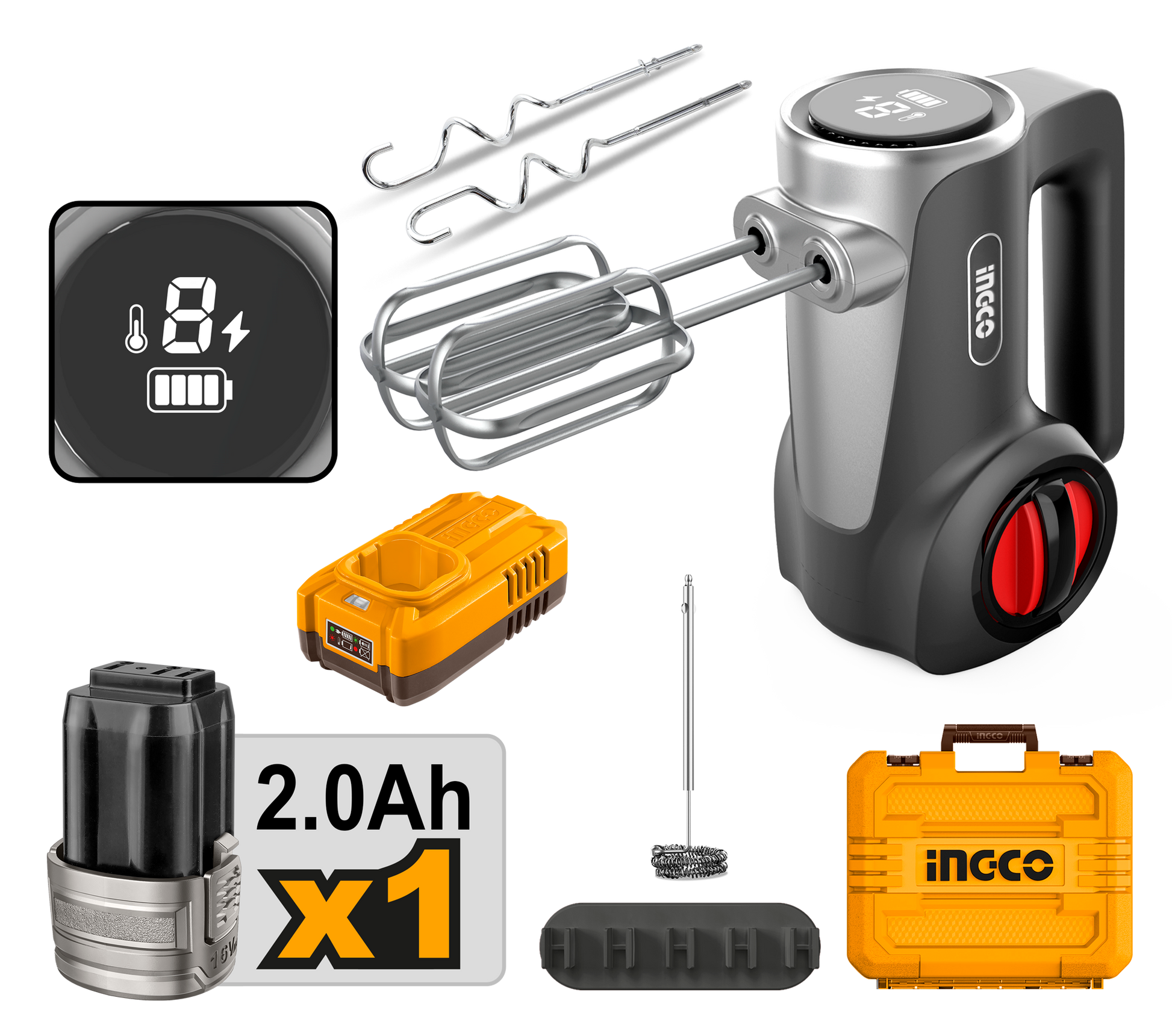 125W power with 7-speeds, 16V operation and LED display. Self-standing design with ejection button. Includes whipping and mixing Accessories and 2.0Ah battery pack with charger. Case for storage.