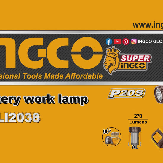 INGCO LED Work Lamp with swivel head. Lumens: 270. Hook for hanging. Battery and charger not included.